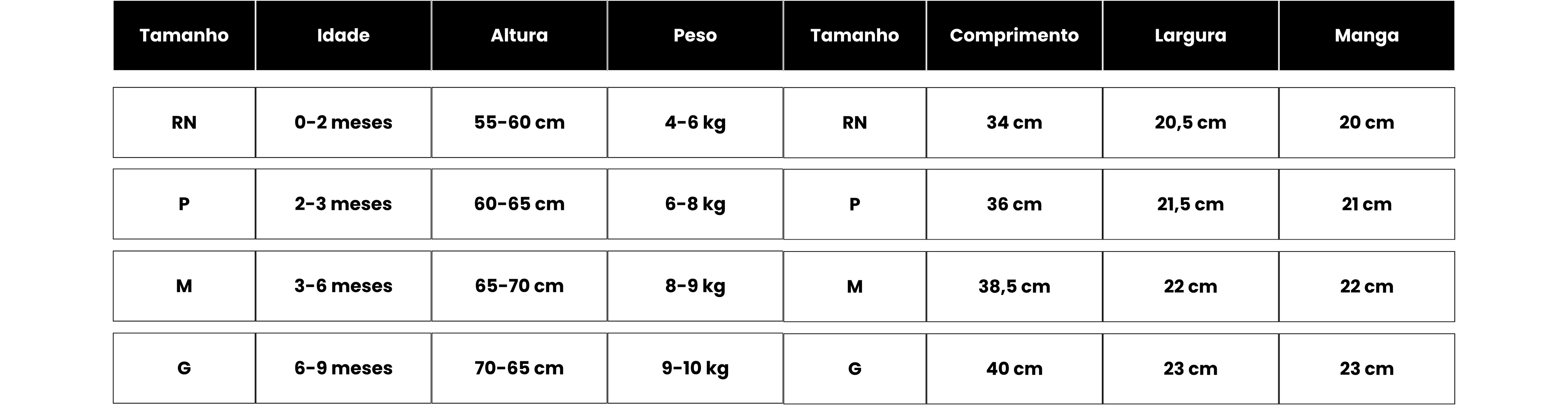 Sabemos que cada bebê tem seu próprio ritmo de crescimento, por isso criamos um guia de medidas para ajudar você a escolher o tamanho ideal do body.